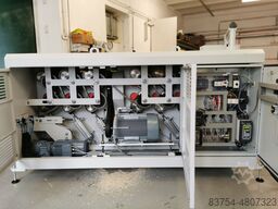 The rounding machines haf a lot of new features. All feed wheel pairs are opening and closed by valve cluster no mechanical dimension adjustment is needed. The rounding machine control is done by movable switch cabinet and control box for pressure regulation of segments of fedd rollers. The motors will be start by softstarter. For smoother surface condition or faster feed speed the machining heads are turning with higher speed. A control system is available for automatic speed control, depending on differenc between final log size and incomming log dimension. For save operation all doors are secured with electrical holder. To open the door the machine has to be stopped. This is needed to fulfill the high expectation of the the machine safety for secure operation.
